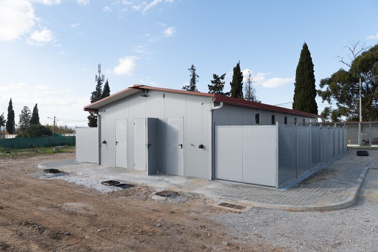 O edifício de serviços, com uma área de implantação/construção de 163,39m2, garante as seguintes valências: zona de receção; gabinete veterinário; sala de fármacos; sala de tratamentos/esterilização; sala de operações; zona de higienização; armazém de cadáveres; armazém de rações; armazém de material de captura; e instalações sanitárias.